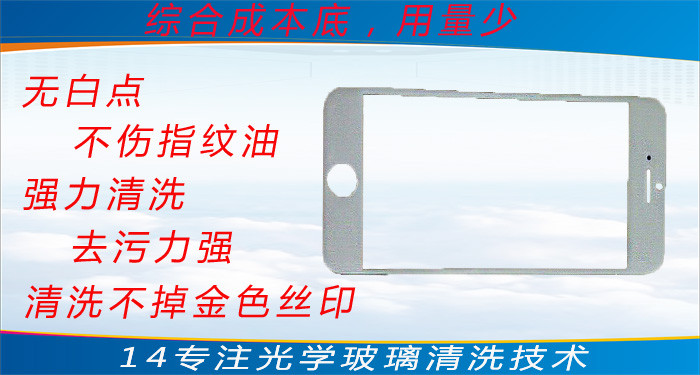 1.無白點、無水印,不發蒙,不腐蝕。 2.不掉鏡面銀、不脫油墨。 3.光潔透亮、不發霧。 4.清洗后順滑、易擦拭。 5.極易溶于水、不易揮發、無刺激性氣味。 6.對各種玻璃等均安全、無腐蝕性。 7.不含硫、笨等有毒及腐蝕性物質,可生物降解,對環境無害。 8.清洗率高,能快速有效的去除研磨粉、油、漆、指印、膠、灰塵等。